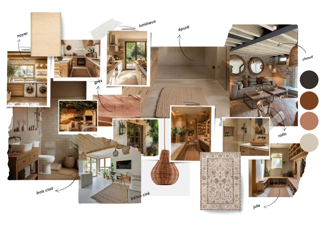 Le souhaite d’une ambiance bohème et chaleureuse, portée par un mélange de matières naturelles, de textures douces et d’éléments décoratifs empreints de personnalité. Le projet vise à renforcer cette identité en apportant plus de cohérence, de fluidité et de chaleur aux espaces de ce nouvel achat immobilier.
